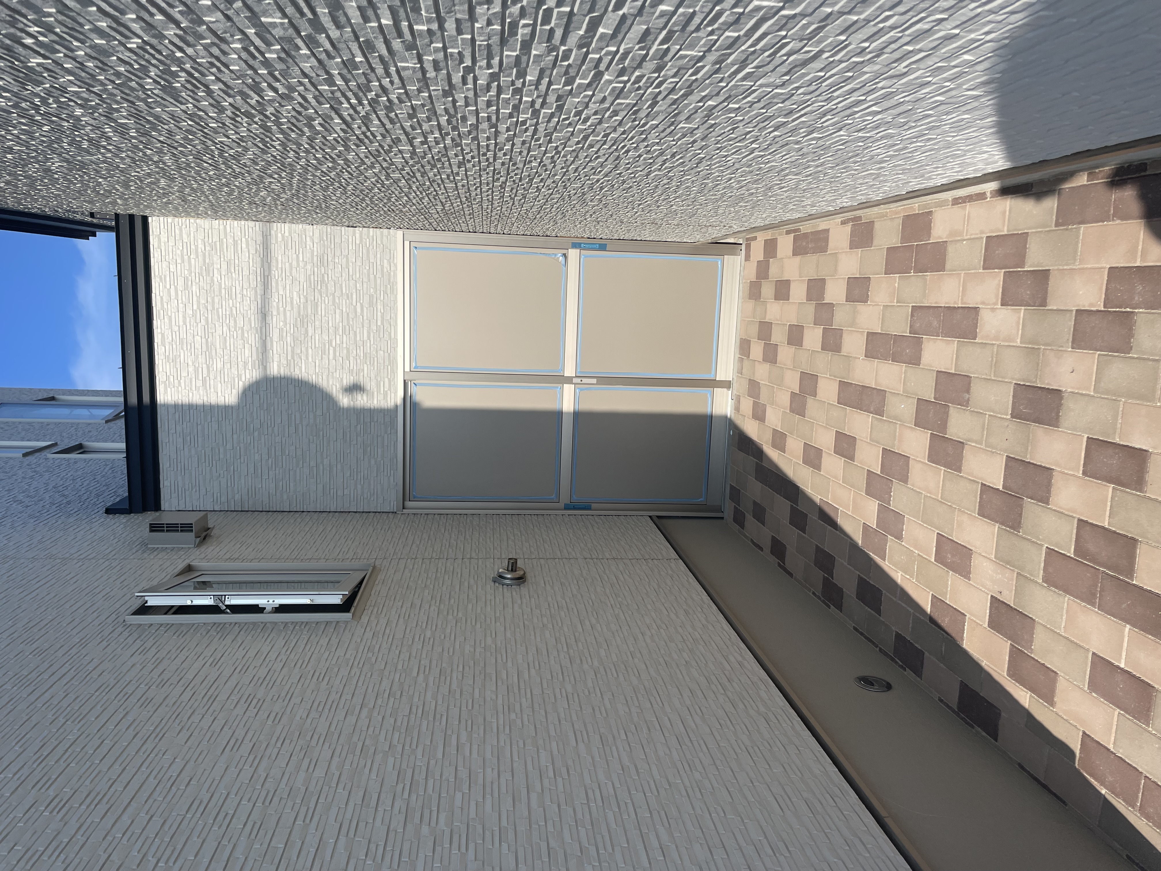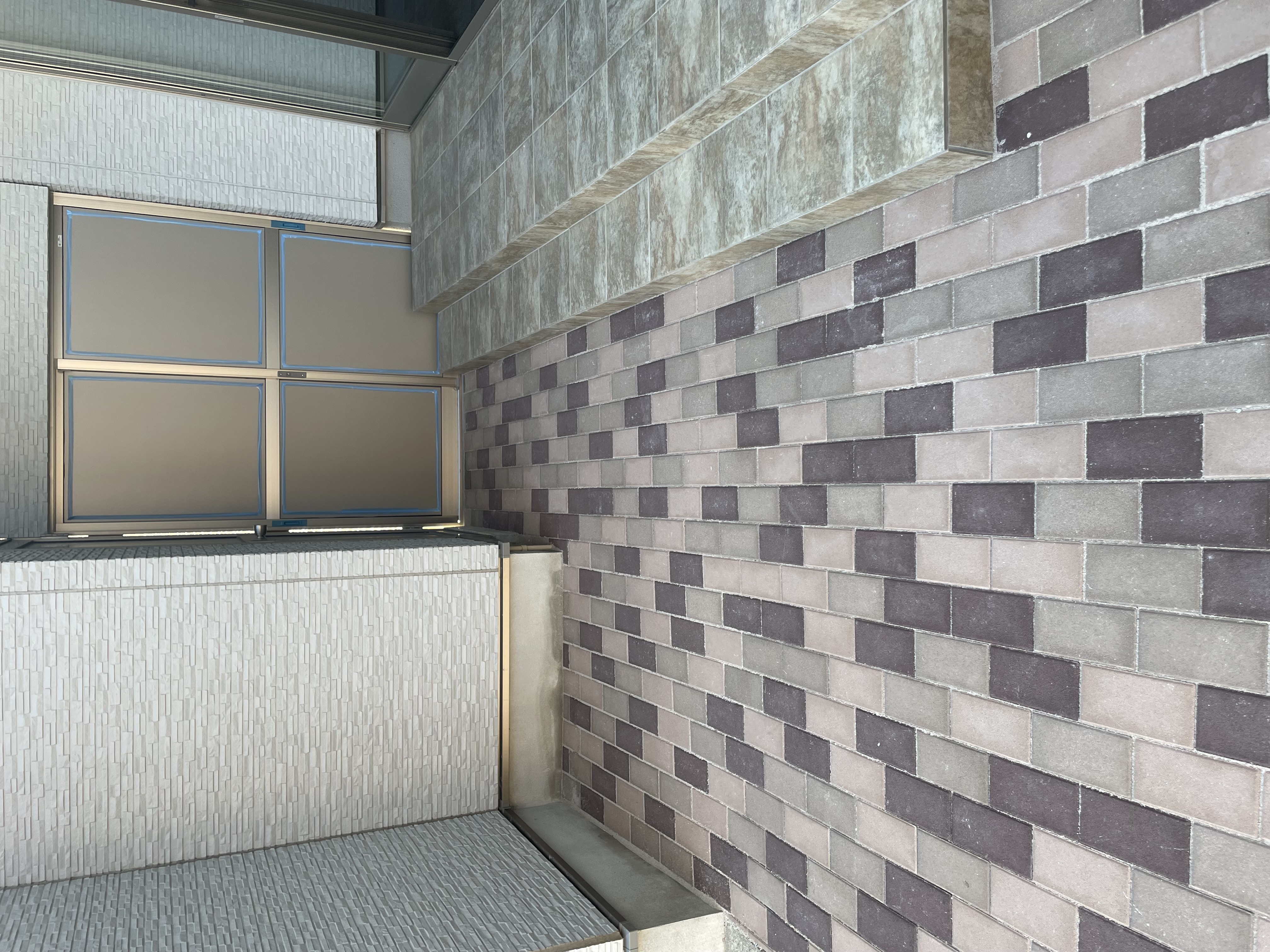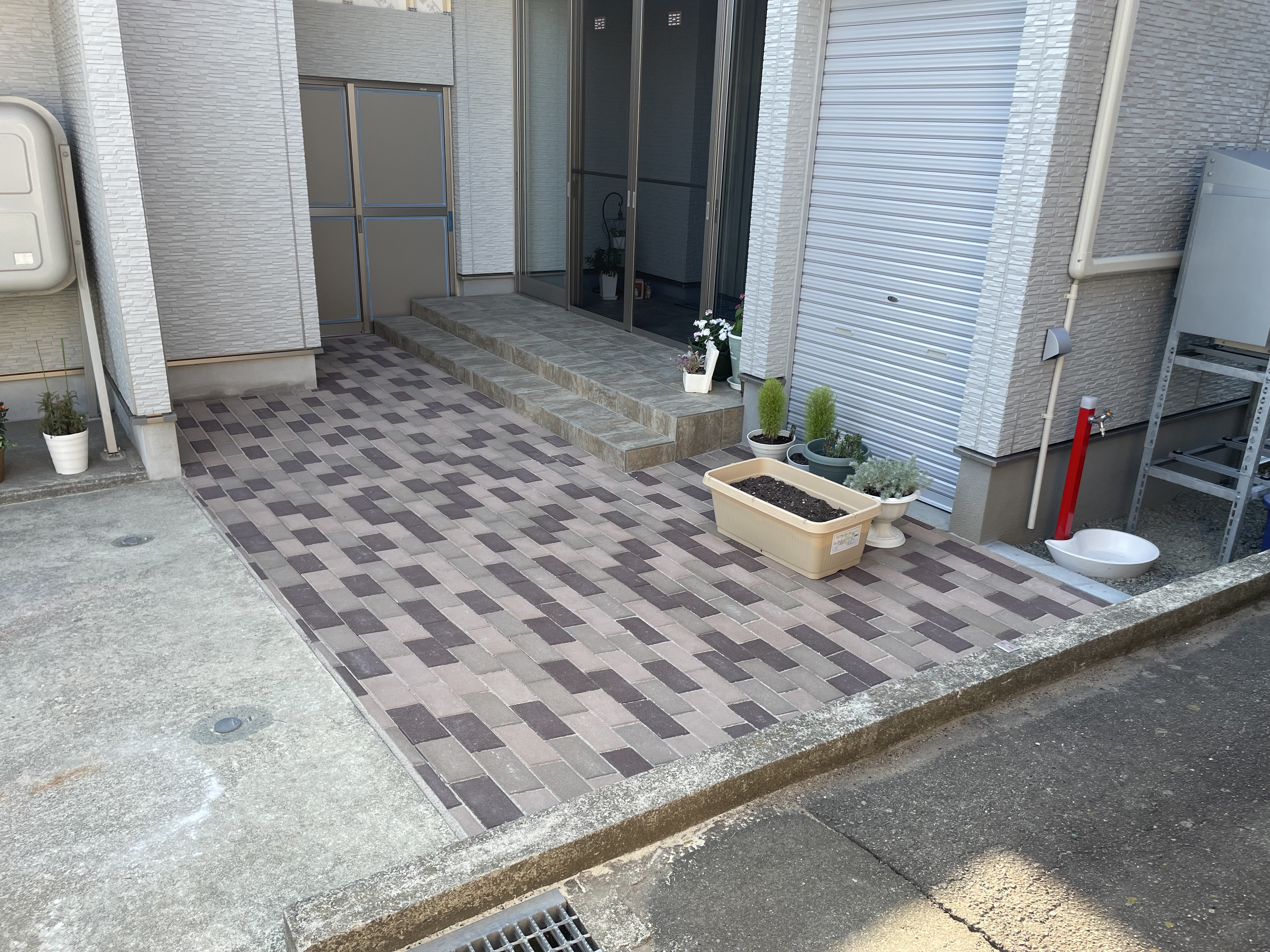 ~玄関前を少しかわいくしたいお客様~住宅と車庫の間と玄関前にインターロッキングを敷き、間仕切りの壁に扉を付け行き来できるようにしました。お庭映えします!